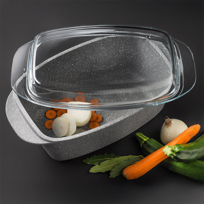 Ottima per la cottura di arrosti e pollame sia su fornello che in forno. Il coperchio può essere utilizzato da entrambi i lati appoggiato sulla rostiera secondo le esigenze e/o l'altezza del forno o come pirofila o vassoio di portata.